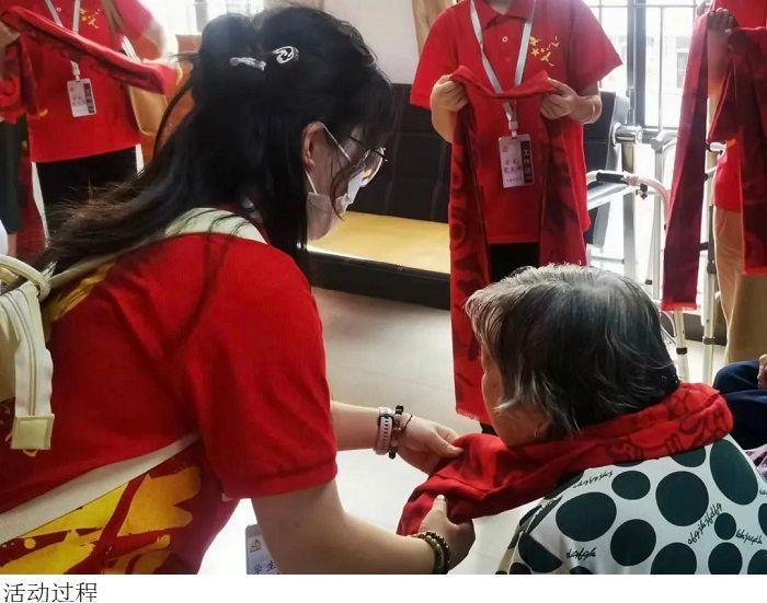 在养老院负责人的带领下,赵宁书记,易晶晶老师以及同学们带着诚挚和关爱之心为老人们分发着面包、牛奶等慰问品,还送去了大米、食用油、面粉等生活物资,期间赵宁书记详细了解了老人们的生活起居、健康状况和切实需求,倾听老人们的心声,并希望他们保重身体,积极面对生活。老人们热情欢迎大家的到来,同学们跟老人们谈心,并为老人们戴上红色围巾,把温暖和爱心送到了老人们的心坎上,让他们感受到青少年们的朝气和社会的温暖。随后,赵宁书记及参与此次活动的全体同学与老人们合影留恋。