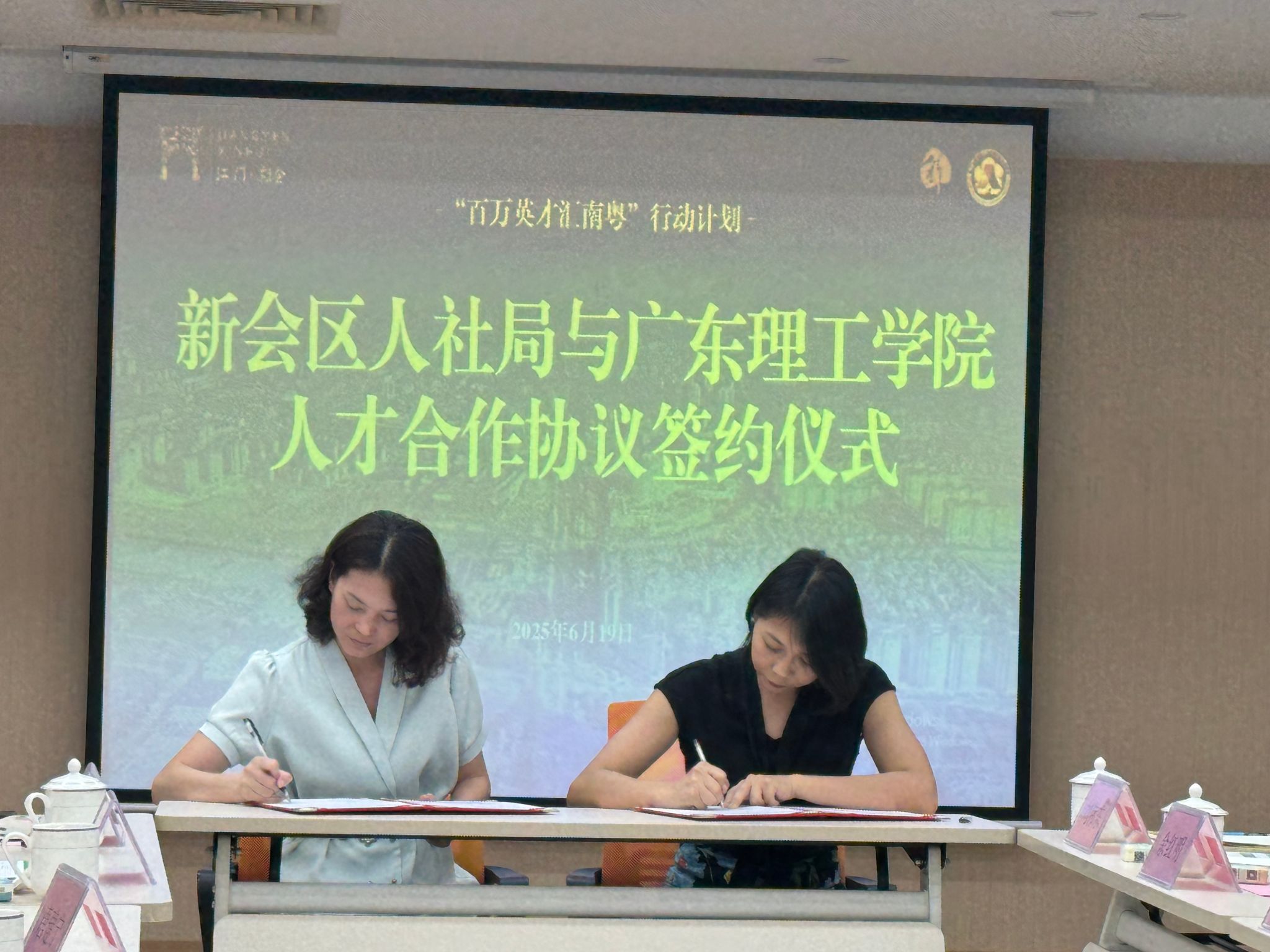 6月19日上午,唐建宁副校长一行首先来到新会区人社局走访交流,在新会区人社局相关工作人员陪同下参观了展厅,深入了解新会区在人力资源开发、就业服务、社会保障等方面的工作成果。接着举行了“校政企”交流座谈会,会上,唐建宁副校长一行与新会区人社局局长聂健雄、副局长何赟、社保局局长赵美芳、专技股股长余红明,智通人才连锁集团江门公司副总经理刘伟东、广东恒申美达新材料股份公司人事经理梁小雅、广东彩艳股份有限公司人事经理黄玉玲、江门市意奇高工贸有限公司人事经理李曙光等就人才引进政策与校地合作机制、产教融合平台建设、实习就业一体化、产教融合实践与技能提升、企业用人需求精准对接等方面进行了深入探讨,并达成了广泛共识。随后,在三方代表的共同见证下,唐建宁代表学校与新会区人社局签订人才合作战略协议,标志着双方在校企合作、人才培养与就业服务等领域合作迈出坚实的一步。