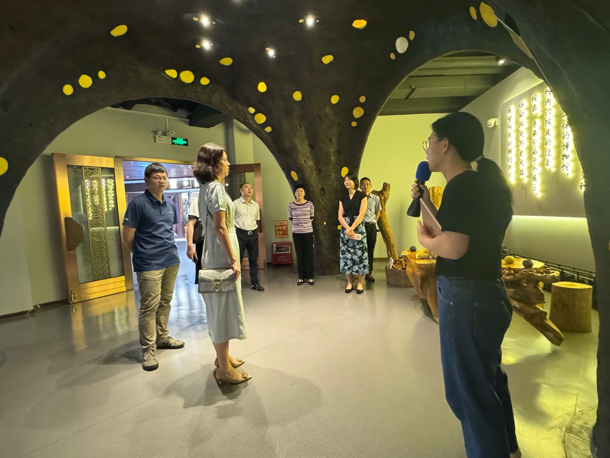 座谈结束后,唐建宁副校长一行在新会区人社局副局长何赟的陪同下参观了丽宫陈皮博物馆,深入了解新会陈皮工艺的悠久历史、独特文化以及产业发展现状,感受新会作为“陈皮之乡”的深厚底蕴。随后,双方又前往非遗传承项目“葵艺”的展示地,在“葵艺”非遗传承人余惠云老师的介绍下,观赏了葵艺制作的精湛技艺,领略了新会丰厚的非物质文化遗产魅力。